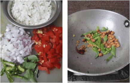 - Wash well and soak poha for 2 mins, then squeeze them and keep aside. Heat oil in pan add popu ingredients and fry. Then add peanuts, curry leaves, chopped green chillies and fry for a while.