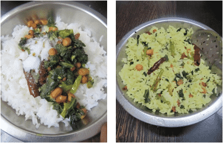 For Popu :   Wash well vaamu aaku/ajwain leaves and chop into pieces. Place cooked rice in a mixing bowl. Heat oil in a pan add popu ingredients and fry, once done add chopped green chillies, curry leaves and fry for a while. Then add chopped ajwain leaves, turmeric powder and fry for a couple of mins on low flame. Now add fried ajwain leaves mixture to the rice bowl and mix along with enough salt. Finally add lemon juice and mix everything well.