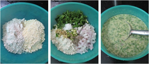 - In a mixing bowl put above all ingredients except oil and mix together, then add enough water to it and make dosa batter without lumps. Now spinach dosa batter is ready, keep aside for 5 mins.