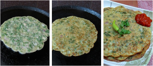 - Heat a tawa and grease it with oil before pouring the batter, pour a ladle full of batter on the hot tawa, apply 1 sp oil on sides of the dosa and cook with cover. When it done turn over to cook on the other side. Repeat with remaining batter to make more dosas. Now tasty tasty wheat palak dosa is ready, serve hot with chutney or chutney powder.